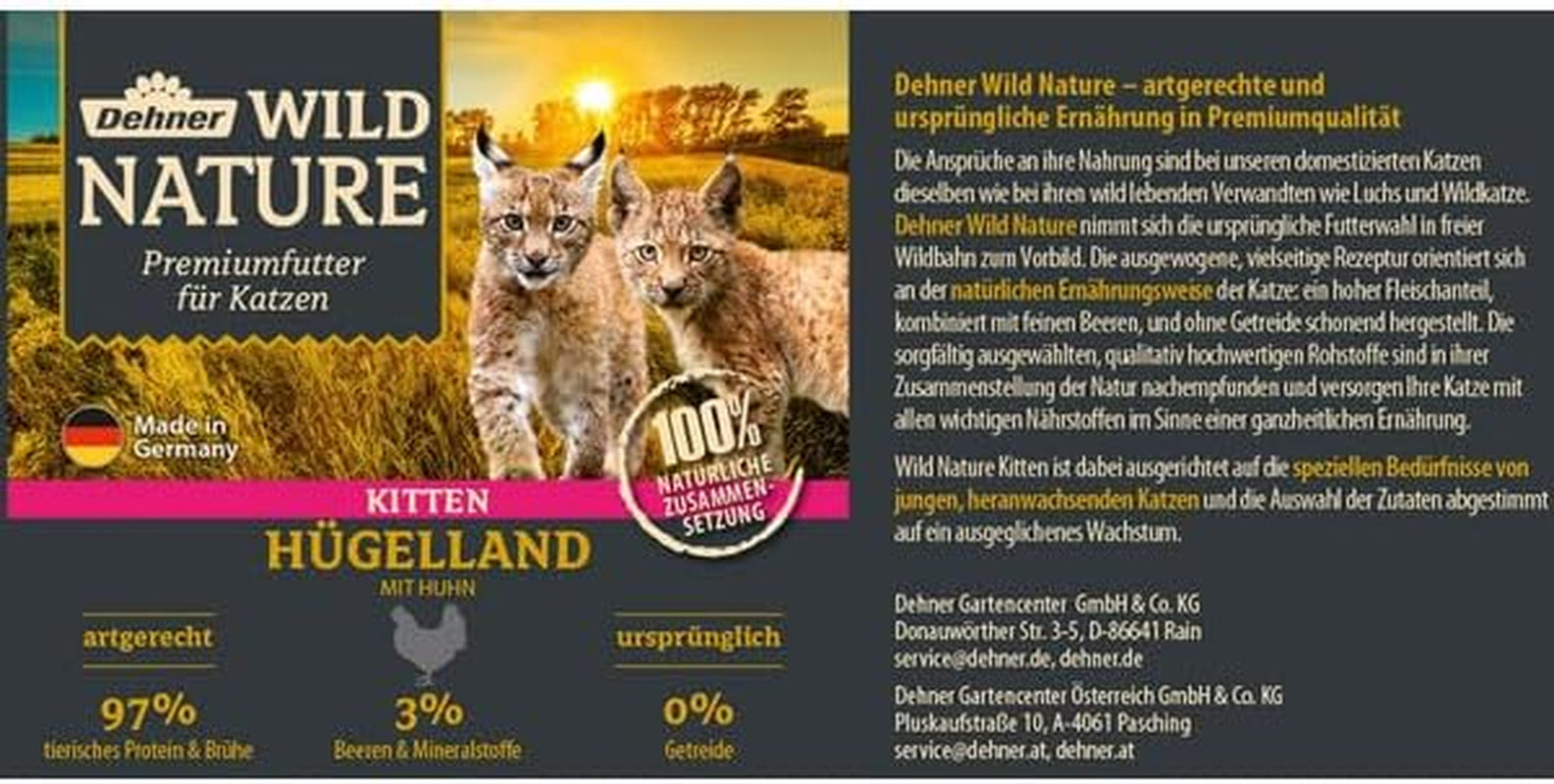 Dehner Wild Nature Kitten Hügelland macskaeledel, gabonamentes / cukormentes nedves táp fiatal macskáknak, kölyköknek, doboz 6 X 200 G (1,2 kg) -