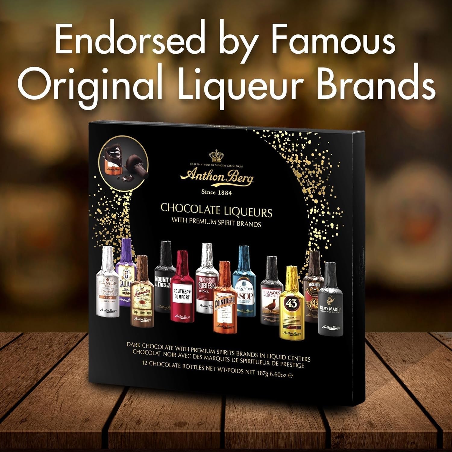 12 étcsokoládé üveg a világ legkedveltebb eredeti szeszes italaival töltve. Ideális ajándék csokoládé és szeszes italok kedvelőinek. Több mint 125 éve – jó csokoládé kompromisszumok nélkül: 1884-ben Anthon Berg megnyitotta csokoládéboltját a dán fővárosban, Koppenhágában, és elkezdte gyártani az egész világon híressé vált csokoládéját. Azóta a mottója mindig a márka céljának emlékeztetője: "Csokoládét gyártani, amelyet a közvélemény kivételes minőségéért elismer." Több mint 125 évvel később is úgy gondoljuk, hogy a csokoládé nem csak csokoládé. Ezért biztosítjuk, hogy a gyártás minden szakaszát szakértő csokoládémestereink felügyeljék, akik gondoskodnak arról, hogy a kakaóbabból végül a legfinomabb csokoládé legyen. Az Anthon Berg folyamatos innovációval a legmagasabb minőségű és kivételes ízű csokoládé gyártásában fejlesztette ki alapvető kompetenciáit.