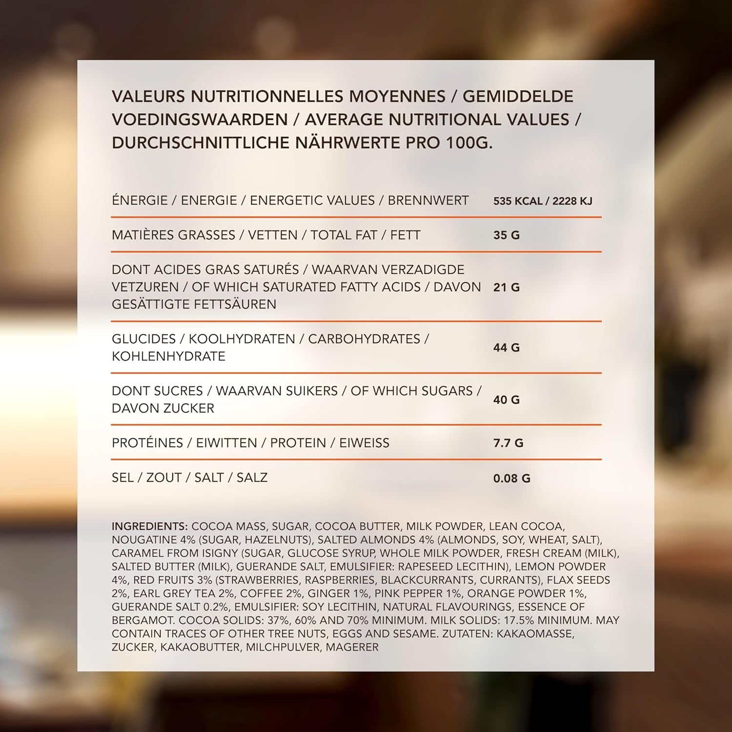 Kakaómassza, cukor, kakaóvaj, TEJpor, sovány kakaó-nugatine 4% (cukor, MOGYORÓ, sózott MOGYORÓ 4% (MOGYORÓ, SZÓJA, BÚZA, só), isigny karamell (cukor, glükózszirup, teljes TEJ por), só, tejszín (Gurandsi) rapszlecitin), citrompor 4%, piros gyümölcsök 3% (eper, málna, fekete ribizli, ribizli), lenmag 2%, szürke tea 2%, kávé 2%, gyömbér 1%, rózsabors 1%, narancspor 1%, Guerande só 0,2%, emulgeálószer: szójalecitin, természetes aromák, bergamott esszencia. Kakaó 37%, 60% és 70% minimum.