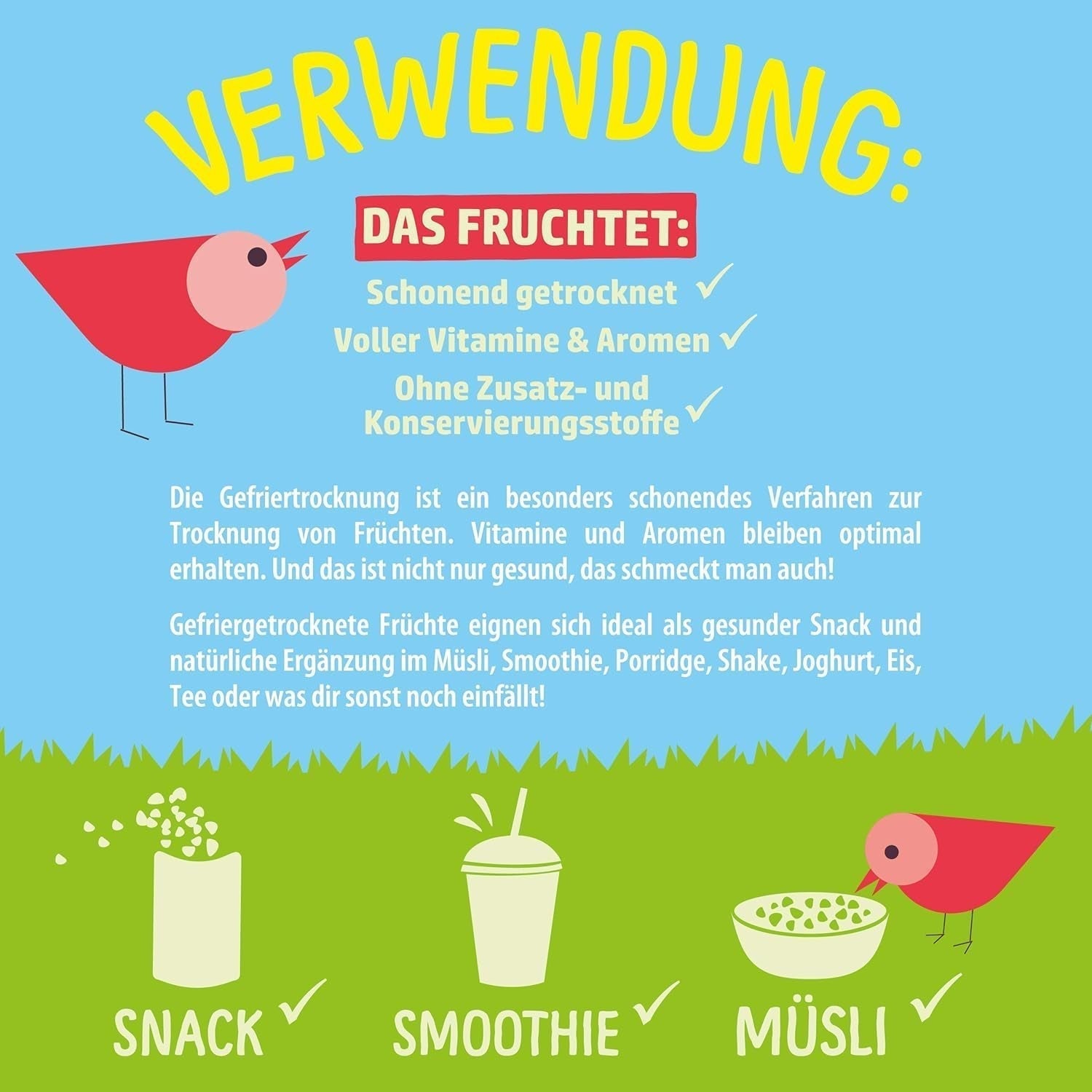 Enyhén fagyasztva szárított gyümölcsök és bogyók friss harapnivalóként, vagy ízletes, friss turmixok és ételek készítéséhez. Intenzív gyümölcsaromával. 100%-ban természetes és gondosan Németországban gyártott.