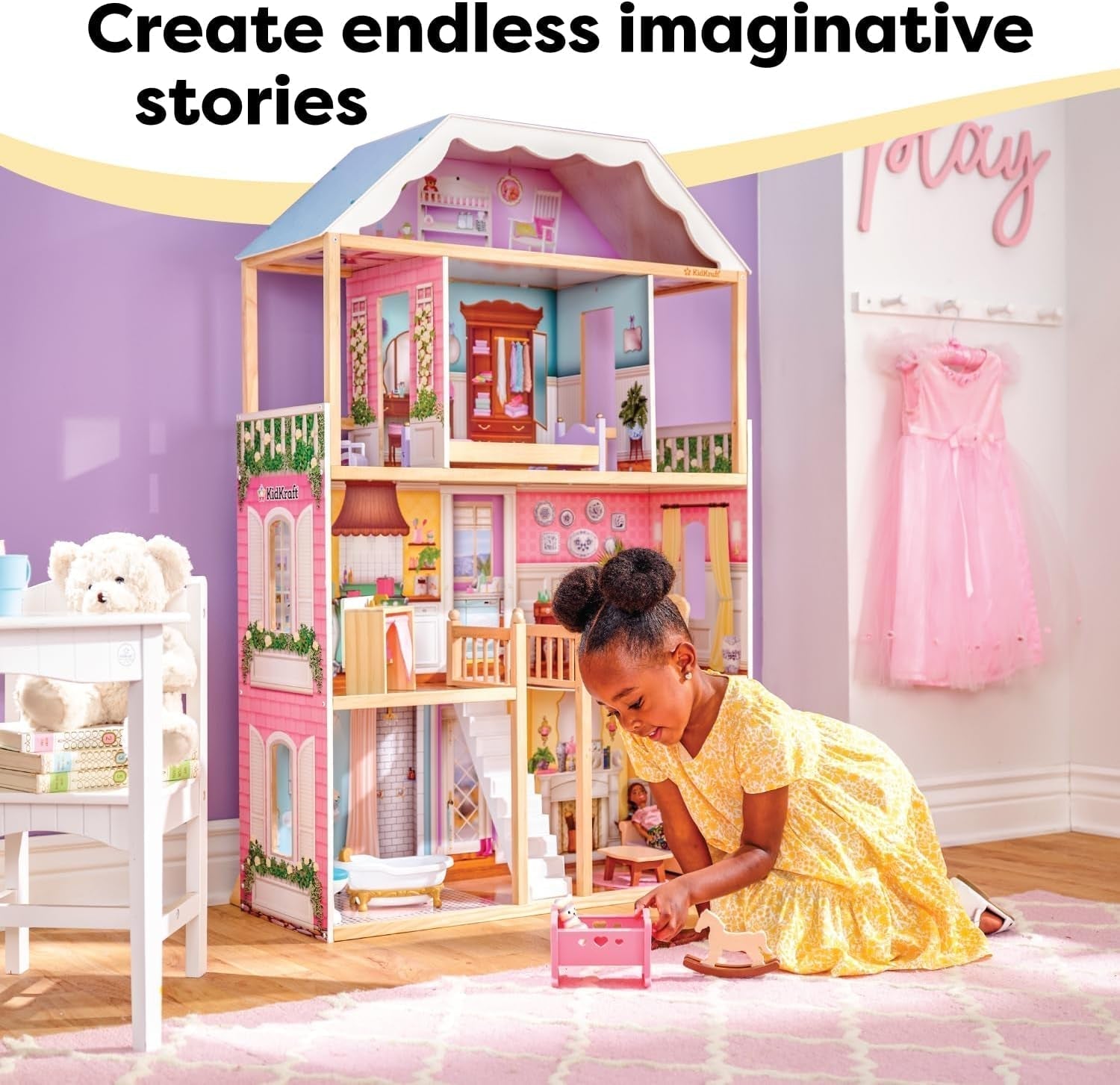 A KidKraft gyönyörű és klasszikus Charlotte babaháza EZ Kraft összeállítással valóra váltja a gyerekek álmait. Több mint 1,2 méteres magasságával és négy emeletével ez a gyönyörű babaház bőséges helyet biztosít több gyermek számára, hogy egyszerre játszhassanak. Legyen szó pihentető habfürdőről az extra mély fürdőkádban, vagy a ház díszítéséről a 14 darabos bútorkészlettel – a gyerekek fantáziájának nincs határa, amikor 30 cm magas babáikkal játszanak. És ami a legjobb az egészben, az innovatív EZ Kraft összeszerelési technológiának köszönhetően a szeretetteljesen megtervezett, masszív babaház gyorsan összeszerelhető, így több idő marad a játékra.