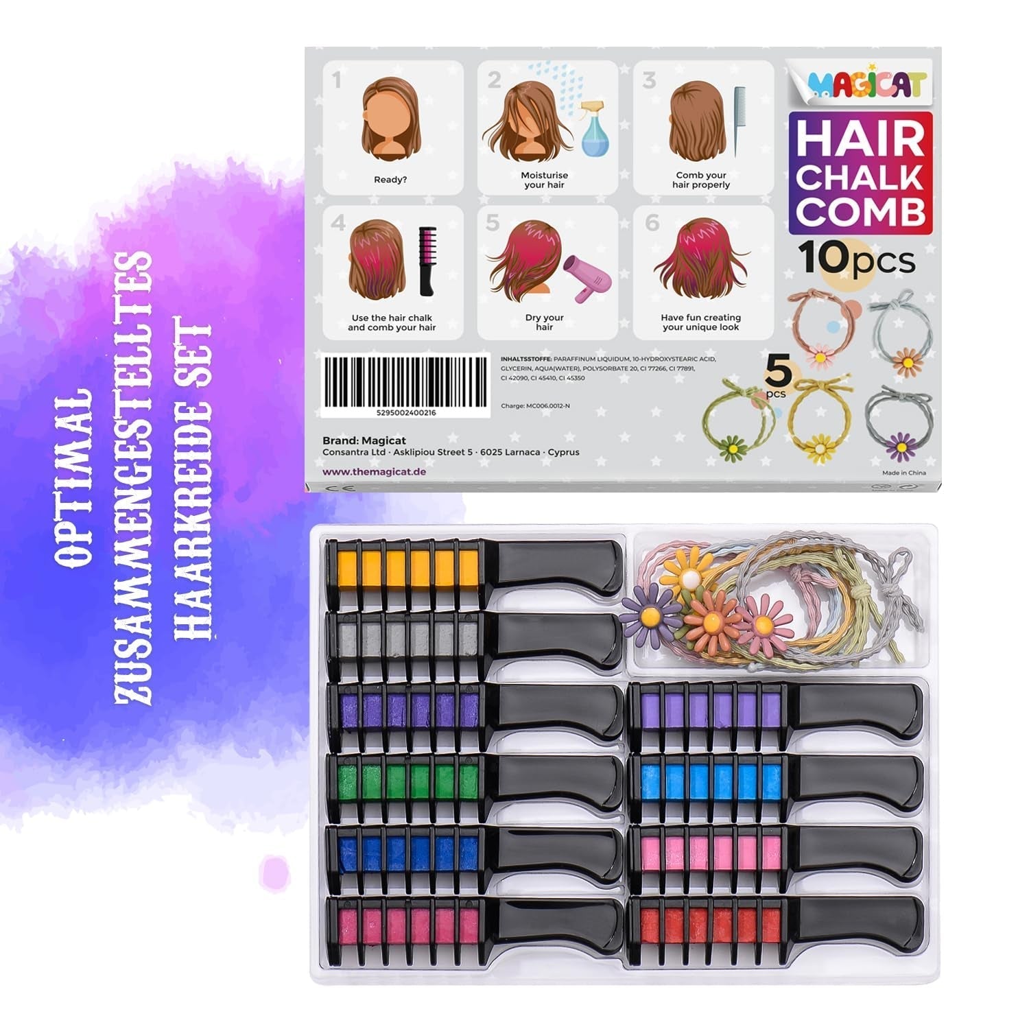 Magicat hajkréta lányoknak szett I 10 mosható szín és 5 hajkötő I Ajándék lányoknak 4 évtől 10 évig I Kreatív ajándék gyerekeknek Születésnapi buli 2025 I Biztonságos és színes