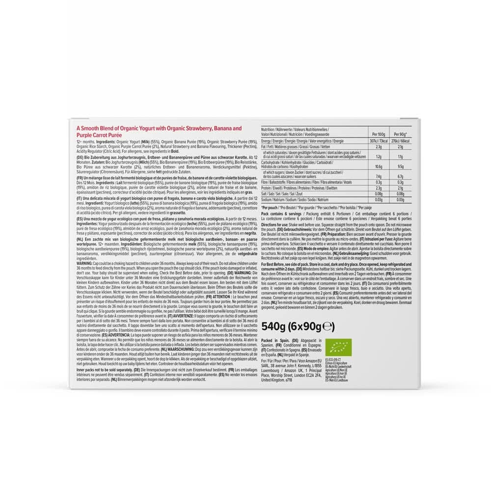 Bio joghurt (TEJ) (55%), bio banánpüré (19%), bio eperpüré (19%), bio rizskeményítő, bio fekete sárgarépa püré (2%), természetes eper és banán aroma, sűrítő (pektin), savanyúságot szabályozó anyag (citromsav).