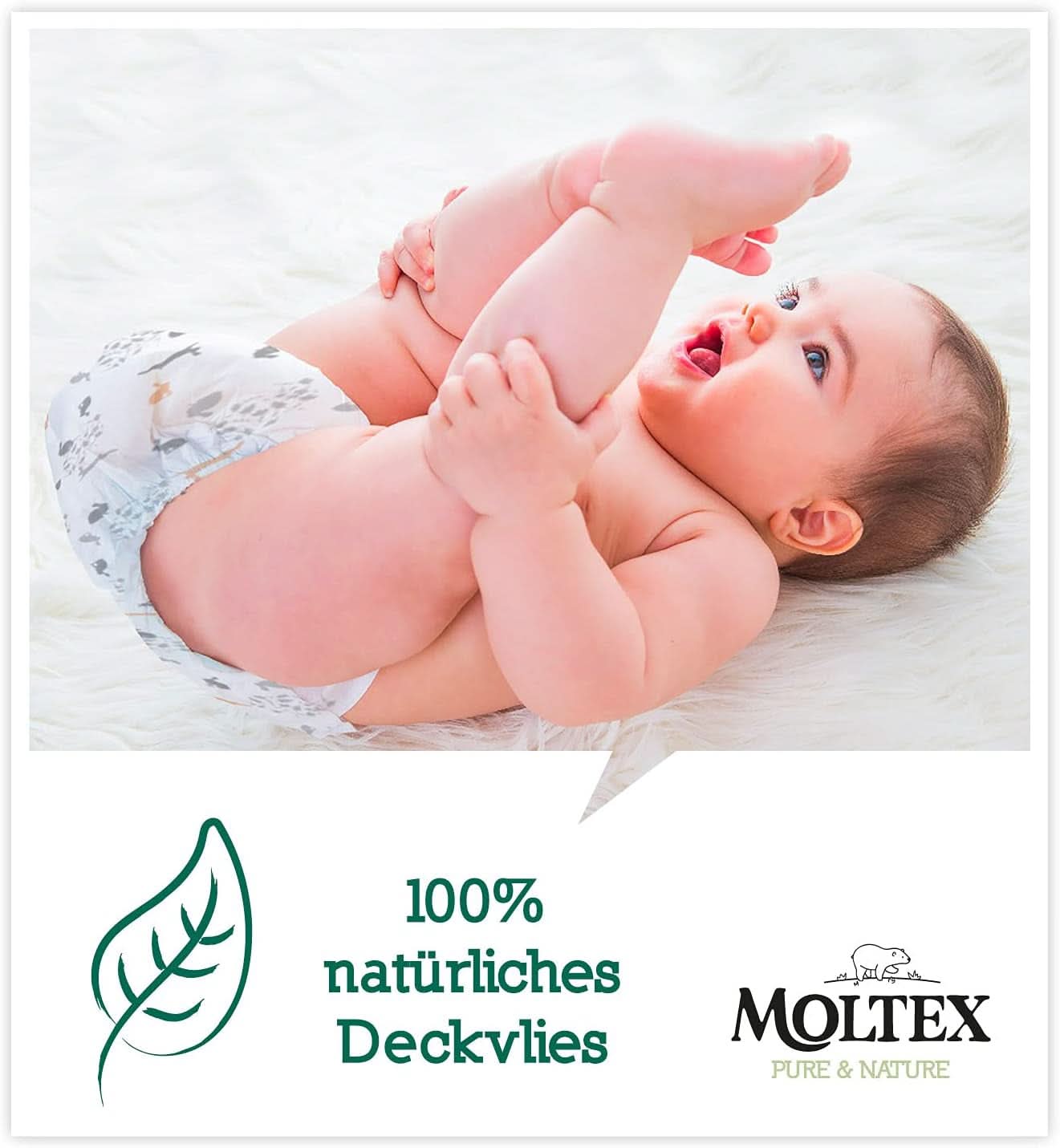 A Moltex nagy hagyományokkal rendelkezik, és 1961-ben vezették be a piacra. A Moltex márka a megbízható és nagy teljesítményű babaápolási termékeket jelenti, amelyek biztonságosak a baba bőrére, ugyanakkor különösen környezetbarátak. Új MoltexX Pure & Nature-ünkhöz csak a legújabb gyártási és minőségellenőrzési technológiákat alkalmazzuk, a pelenkák pedig kizárólag Németországban készülnek 100%-ban zöld energiával. Az új Moltex Pure & Nature nemcsak különösen strapabíró, hanem biztonságot és kényelmet is nyújt a baba érzékeny bőrének. Az új Moltex Pure & Nature 100%-ban puha és természetes belső gyapjúval és szuper puha organikus pamut külsővel rendelkezik. Ezenkívül a pelenkák különösen bőrbarátok, és nem tartalmaznak természetes latexet, testápolókat és illatanyagot. A továbbfejlesztett magnak és a légáteresztő anyagoknak köszönhetően az új MOLTEX Pure & Nature akár 12 órás védelmet nyújt a szivárgás ellen nappal és éjszaka egyaránt. A MOLTEX Pure & Nature hat különböző méretben kapható, elbűvölő állatmotívumokkal, amelyek izgalmas kalandokba kísérik a kis pelenkahősöket és szüleiket. A kis drágákat az erős és bársonyos pelenka támogatja, amely különösen kíméli a baba finom bőrét és extra kényelmet biztosít. Ez szórakoztatóvá teszi a felfedezést.