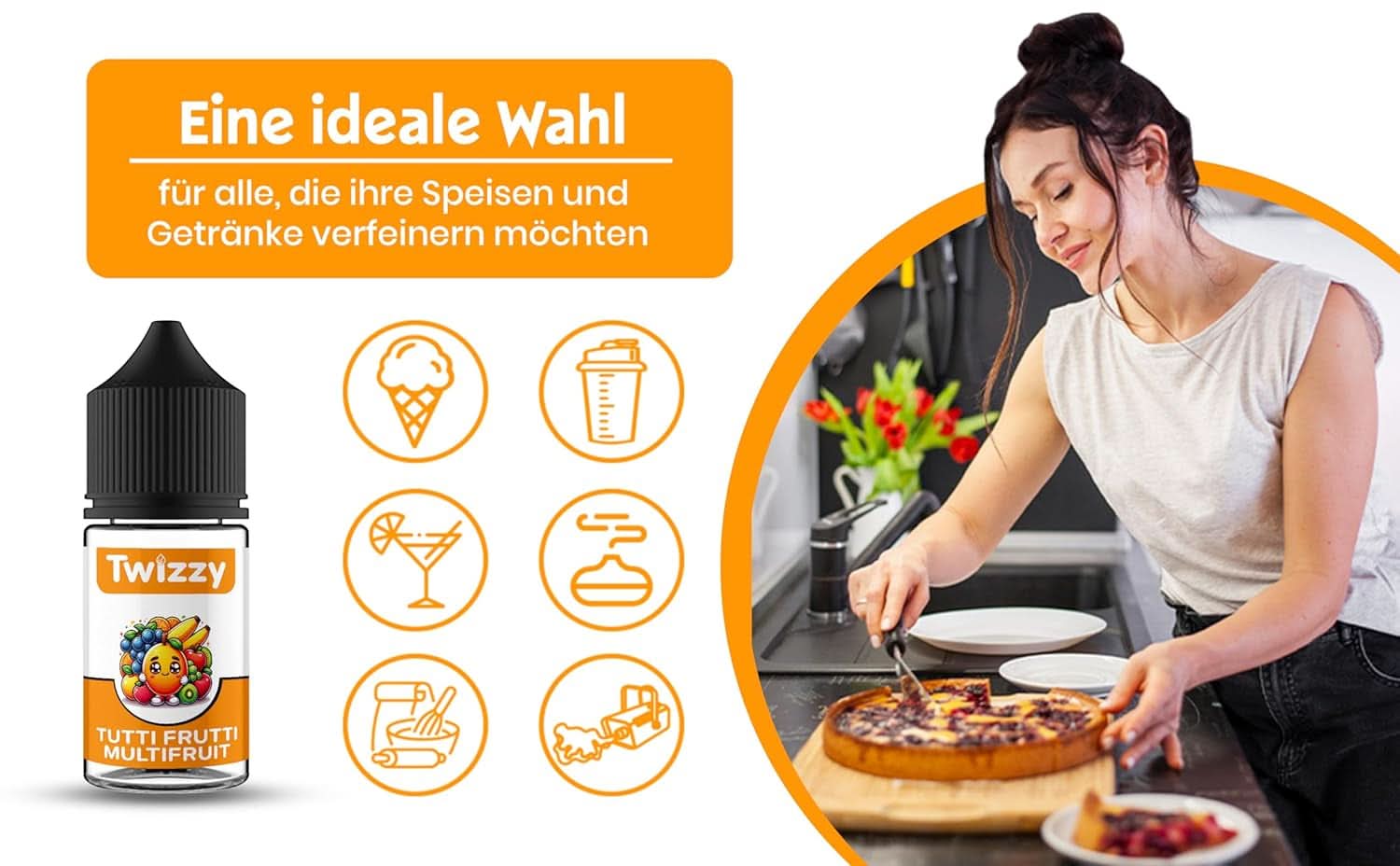 Fedezze fel a Twizzy Tutti Frutti ízét, amely igazi gazdagítója konyhájának. Ez az intenzíven illatos íz kivételes ízélményt kínál, és kiválóan alkalmas különféle ételek és italok ízesítésére. Tökéletesen passzol kávéhoz, turmixokhoz, süteményekhez, túróhoz és joghurthoz, és különleges ízt ad minden recepthez. A Tutti Frutti ízünk cukor-, zsír- és laktózmentes, így ideális az egészséges táplálkozáshoz. Vegánok számára is alkalmas, és rugalmasságot biztosít a használat során. Az ízét saját ízlése szerint alakíthatja kedvenc édesítőszerének hozzáadásával. A kényelmes csepegtetős palack egyszerű és pontos adagolást tesz lehetővé, így az íz ideális főzéshez, sütéshez és italokhoz. Tökéletes a kreatív szakácsok és amatőr pékek számára, akik egy kis innovációt és gyümölcsösséget szeretnének adni receptjeikhez. Fedezze fel a Tutti Frutti ízének sokoldalúságát, és tapasztalja meg, hogyan emelheti ételeit a következő szintre