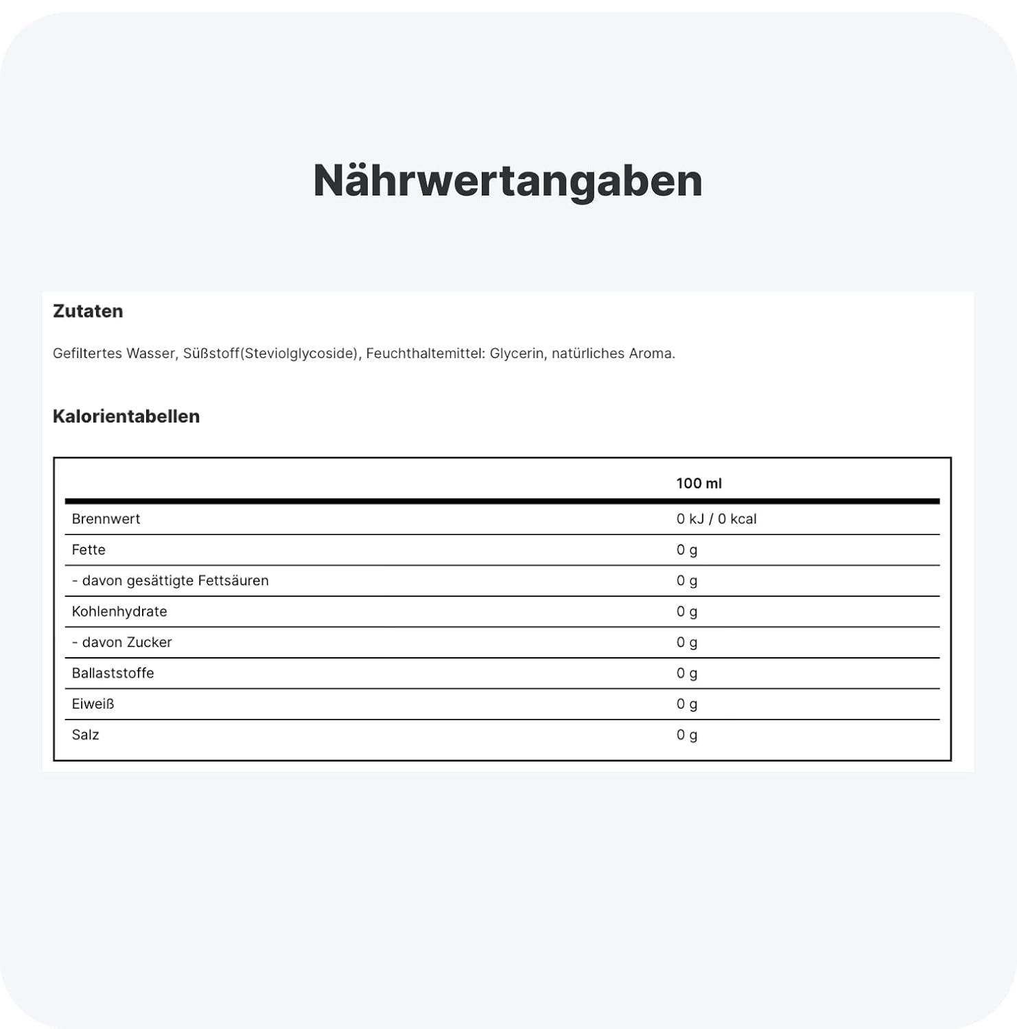 Gefiltertes Wasser, Süßstoff (Steviolglycoside), Feuchthaltemittel: Glicerin, Natürliches Aroma.